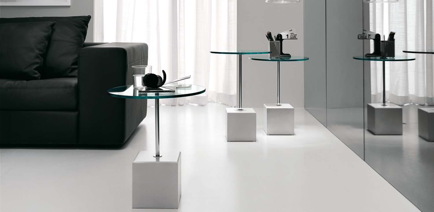 Axo je konferenční stolek, jehož ocelový podstavec je bíle nebo černě lakovaný. Na chromované nožce je usazená kulatá deska z čirého skla.