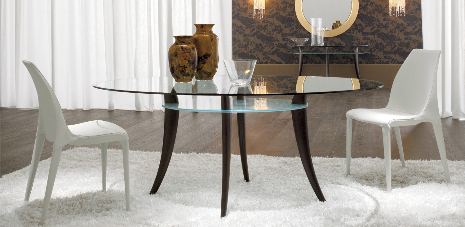 Jídelní stůl Blade má klasické dřevěné nohy, které jsou dostupné v ořechovém dřevě Canaletto, dřevě Wenge nebo v černém buku. Stůl má dvě skleněné desky: horní z čirého skla a spodní menší ze skla matného.