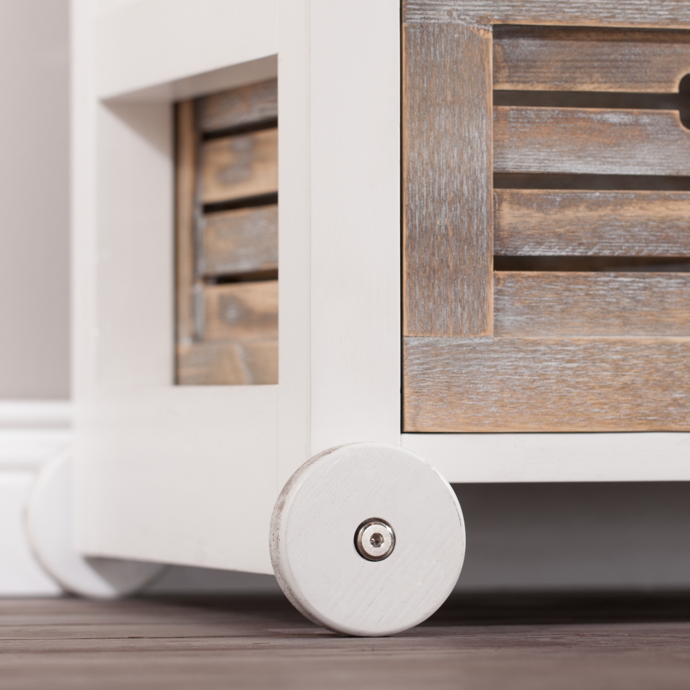Tento servírovací stolek bude Vaším osobním vrchním a bude vždy na tom místě, kde ho potřebujete. 80 cm dlouhá pracovní deska se dá pomocí výklopného mechanismu zvětšit na 100 cm, zásuvky a přihrádky nabízejí dostatek dalšího odkládacího prostoru. Do středu vozíku můžete umístit např. láhve. Ve stylu "Vintage-Look". Dopřejte si s řadou CAMPAGNE kouzelnou atmosféru jižní Francie. Světlý nábytek a další doplňky nesou lehké stopy opotřebení, jako byste se z nich těšili už celá léta. Každý jednotlivý kousek dokonale podtrhne charakter Vašeho domova. Určeno pouze do interiéru. Dodáván rozložený s návodem k montáži.