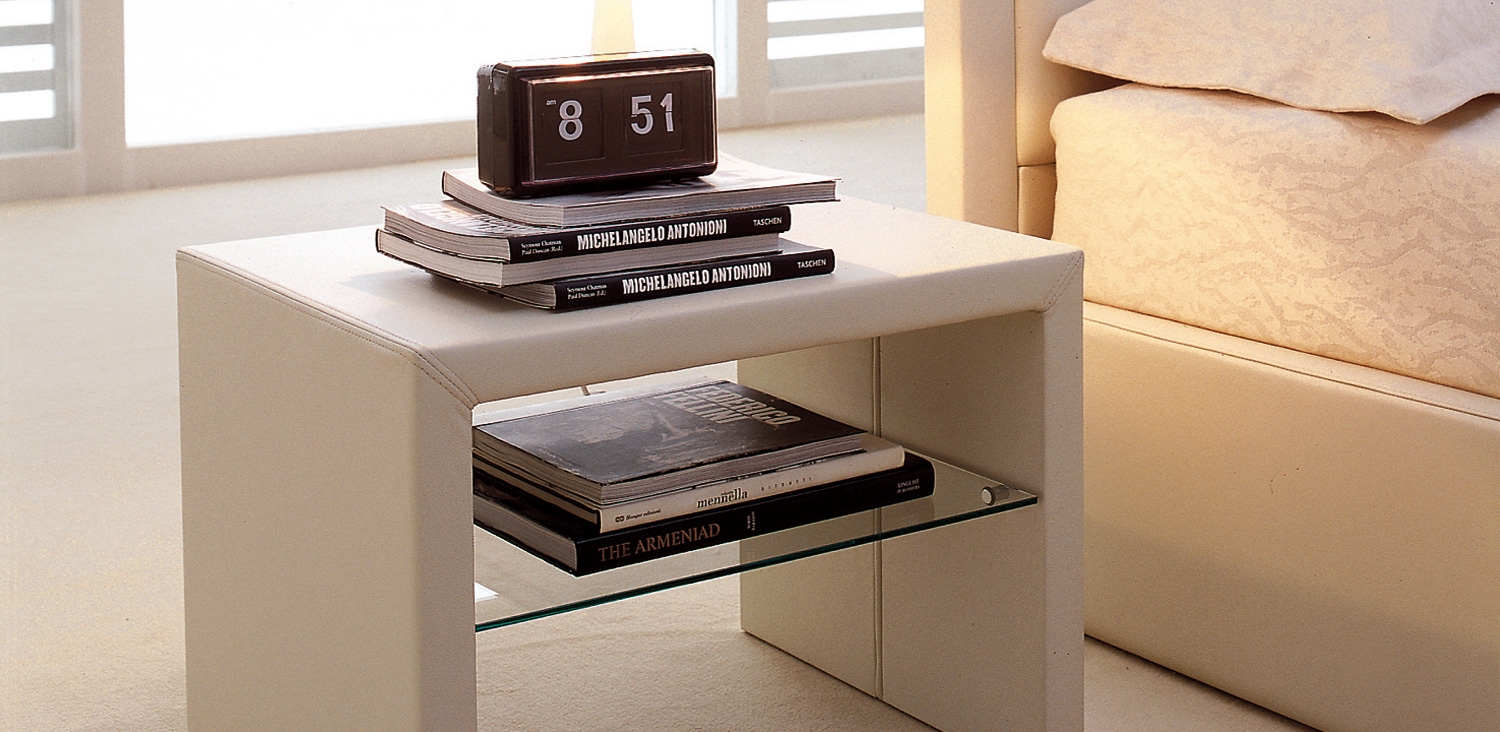 Noční stolek Dorian s dřevěnou konstrukcí je celý potažený kůží (syntetická nebo měkká). Obsahuje polici z transparentního skla.