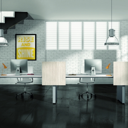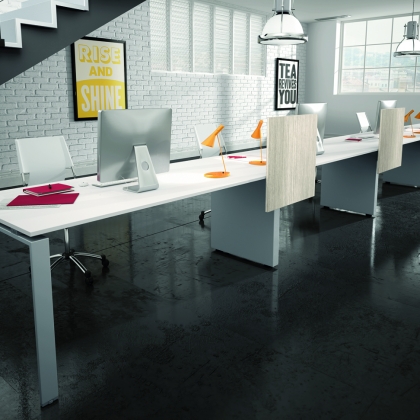 Sestava kancelářských stolů Draco s bílou deskou. Přepážku lze umístit v libovolném místě horní části a jsou k dispozici ve všech melaminových provedeních.