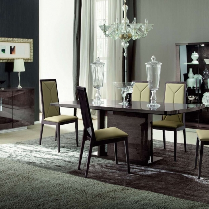 Nábytek hodný luxusních jídelen, velmi elegantních a velmi exkluzivních. Hloubku a intenzitu barvy dřeva zdůrazňuje povrch s vysokým leskem. Zajímavé je řešení řešení kliky dveří a zásuvek: tvoří stříbrný pruh, který běží středem každého kusu nábytku. Celek působí velmi luxusně.