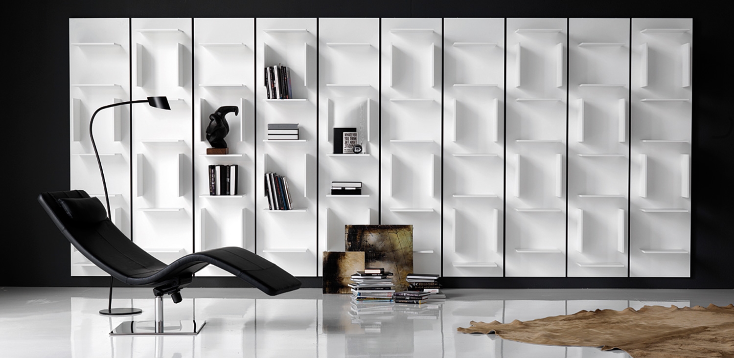 ´Modulární nástěnná knihovna z reliéfního dřeva v bílém nebo ústřicovém laku. Dodává se s horním i dolním připevněním ke zdi.