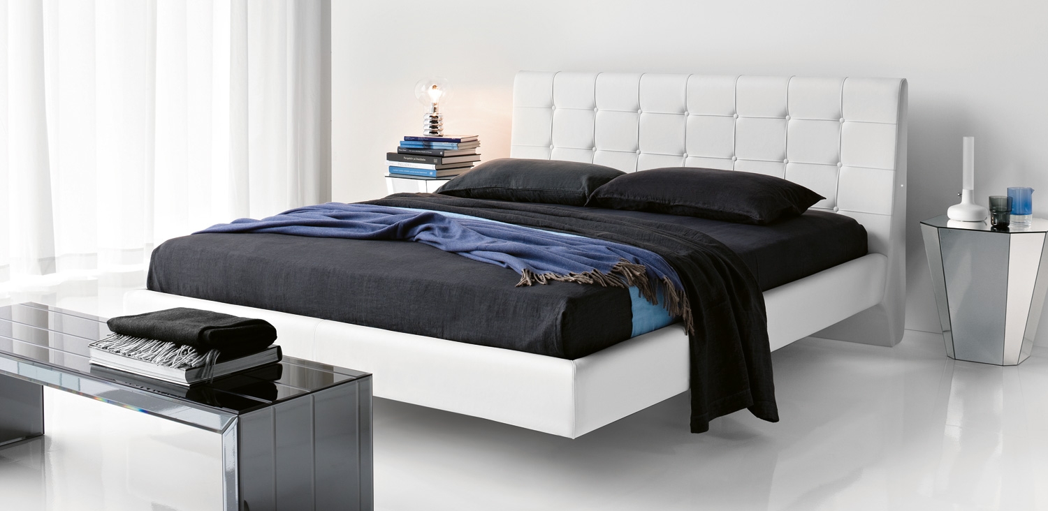 Čalouněná postel s čelem pokrytým látkou, syntetickou nebo měkkou kůží v odstínu dle vzorníku. Nohy postele jsou v chromovaném provedení.