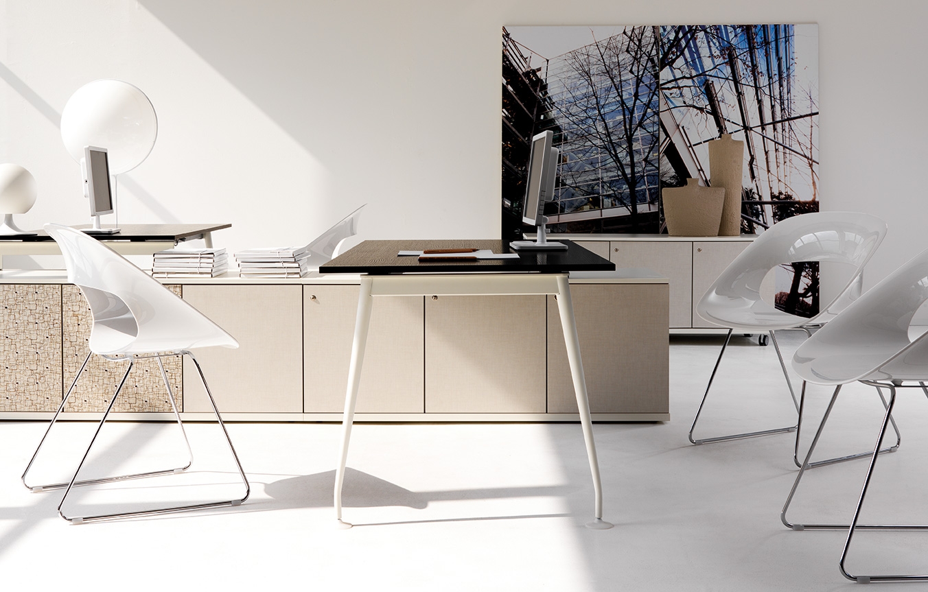 Řada kancelářského manažerského nábytku GIOVE byla navržena italskou designerskou kanceláří Perin & Topan. Je moderní, vzdušna a velmi dobře doplňuje kancelářskou řadu Giove pro operativu. Přináší do prostoru nové a zajímavé řešení. Prvky jsou vyrobeny z výběrového DTD materiálu s možností použití povrchu z melaminu a dýhy, nebo skleněných desek. Moderní kovová podnož je spojena dvěma nosníky, které zabraňují prohnutí stolové desky a vyrábí se ve třech barevných provedení chrom, bílá, šedá a černá.