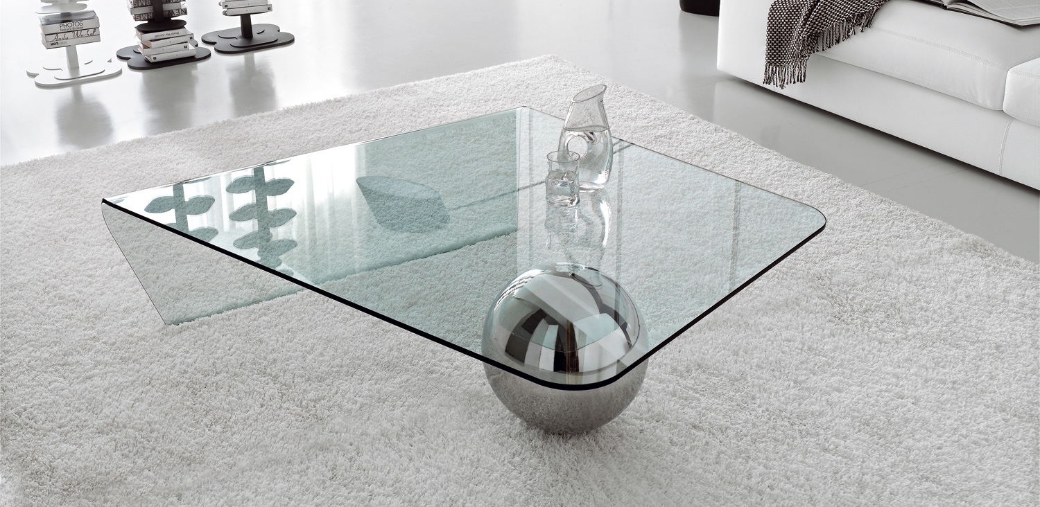 Globe je konferenční stolek s ohýbanou deskou z čirého skla. Nohu na jedné straně tvoří lesklá ocelová koule.