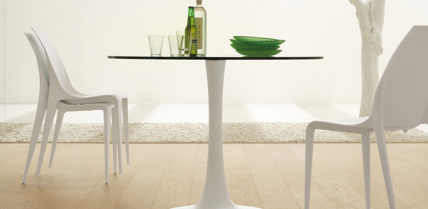 Malý stolek Hugo se skládá z reliéfní polyuretanové nohy, která je dostupná v bílé nebo černé barvě. Kulatá deska stolu je k dispozici v čirém skle, bílé nebo černé lakované MDF.
