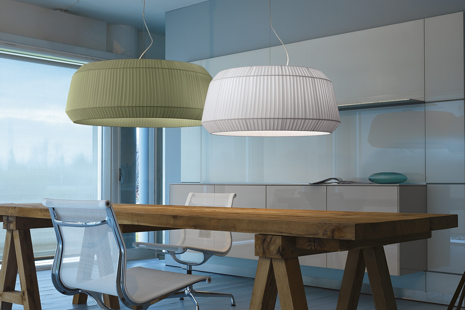 Stínidlo závěsného svítidla Loto je tvořené ručně skládanou textilií. Spodní panel je z opálového plexiskla.