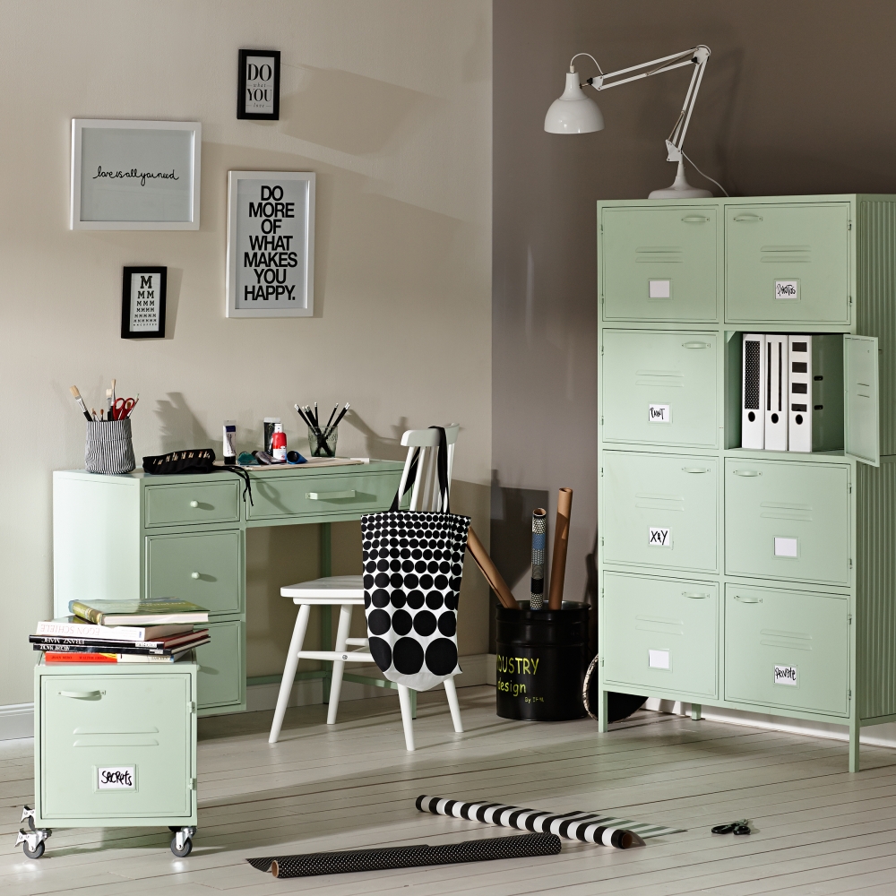 Nemusíte mít na seznamu skladeb žádný heavy metal, abyste se stali fanoušky nábytku Metallica. Průmyslově kovový nábytek se spřátelil s překvapivě jemnými zelenými tóny. Tato kombinace vytváří velmi vzrušující kontrast.