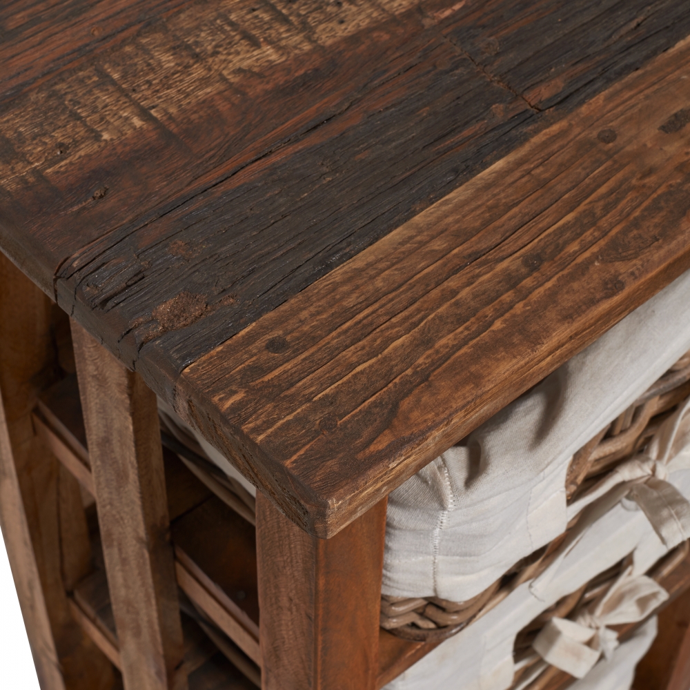 Rozhodně více než jeden déšť a mnoho jiných dobrodružství už zažilo toto recyklované staré dřevo, což dodává řadě nábytku Monsoon lehce zemité kouzlo. Povrchy vypadají autenticky hrubé, částečně jako pořezané, s viditelnými otvory a rýhami. Tím získávají charakteristický vzhled. Zde: regál s 3 košíky.