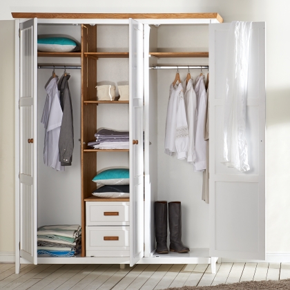 Dotek romantiky, stopy bílé barvy na přírodním dřevě, krásné tvary a okouzlující kované úchyty - takto nekomplikovaný a univerzální dokáže být vzhled středomořského stylu. Řada Providence vyjadřuje bezstarostný pocit lehkosti a energie. Spontánní stěhování nábytku bude jednoduchou záležitostí díky nízké hmotnosti jednotlivých kousků. Zde: šatní skříň se 4 dvířky, k dispozici v dalších variantách.