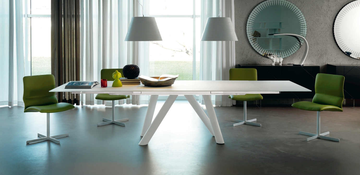 Velký rozkládací stůl jehož podstavec je dostupný v následujících provedeních: chromovaná ocel, bílý, grafitový lak nebo kombinace. Kolejnice rozkládacího mechanismu je vždy v barvě horní desky. Stolová deska je z 10 mm silného skla ve variantách: čirá, grafitová a bílá.