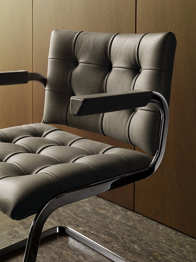 Židle, která byla navržena již v roce 1950, neztratila nic ze své elegance a stylu. Toto židle z reedice má oproti původní ikoně poněkud štíhlejší čalouněný povrch, její výška sedáku byla mírně upravená a rám přizpůsobený novým požadavkům. K dispozici je verze s područkami a také provedení bez prošívání a knoflíků. Jinak zůstala tato švýcarská klasika nedotčená.