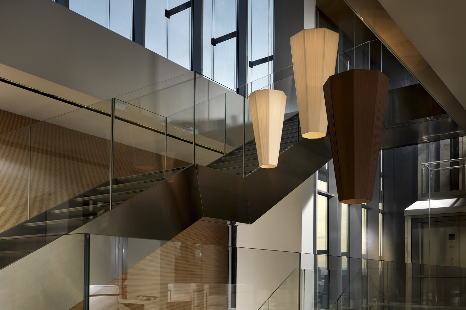Závěsné svítidlo se stínítkem z ručně skládané plisované tkaniny.