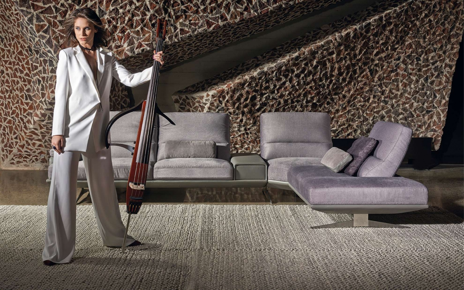 Sedací souprava v sestavách: 3 osobové pohovky. Prodloužené moduly nebo rohové sestavy v několika verzích. Relaxační mechanismy – 3 stupňová regulace nachýlení opěrky s dodatečnou regulací horní části opěrky. Dodatečná možnost mít v područce zásuvku se systémem Push Pull a tichým zavíráním. Nohy kovové.