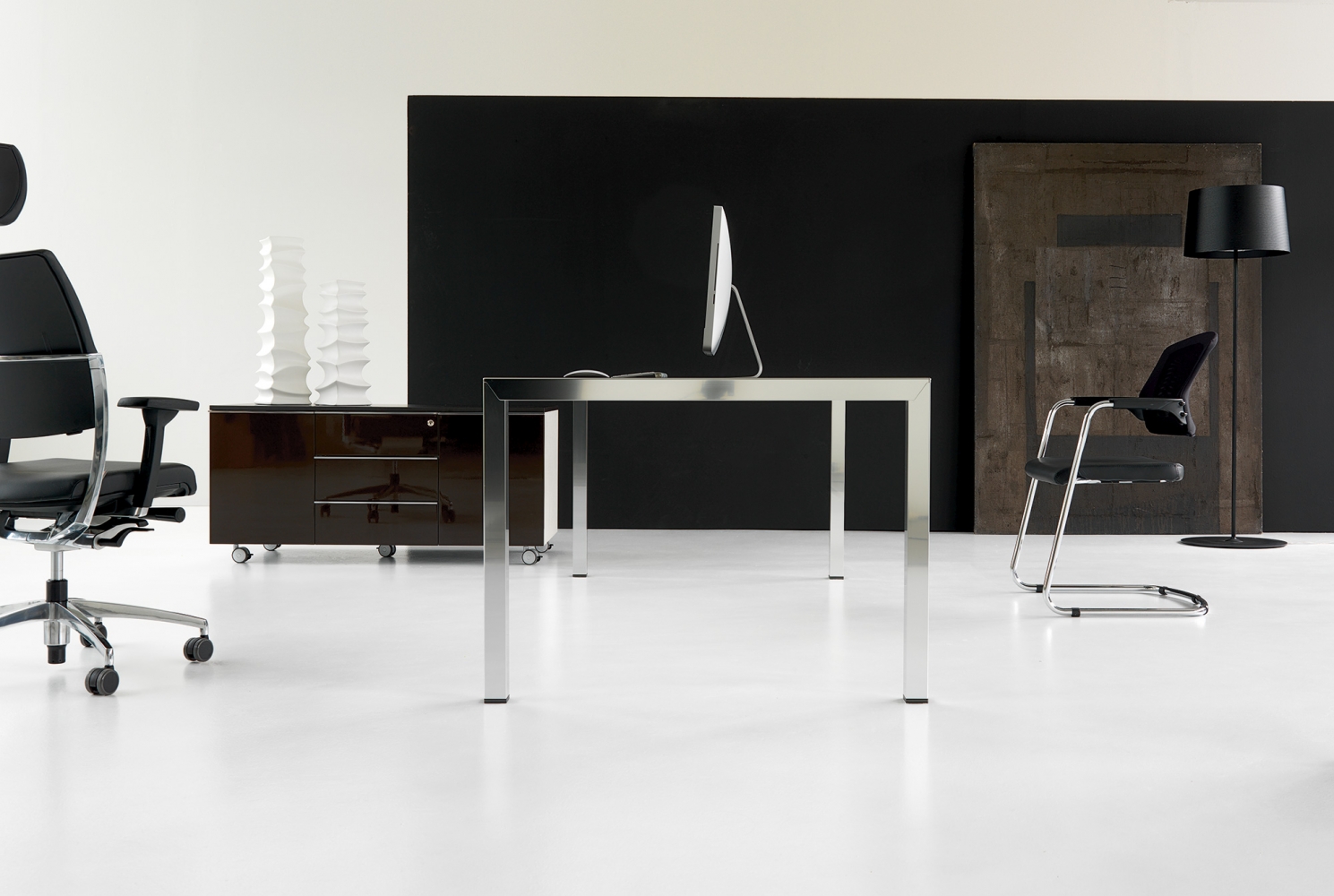 Exkluzivní provedení tohoto kancelářského nábytku pro TOP management, jen doplňuje design, a přísně dodržuje jednoduché estetické linie. Toto je designový základ kancelářských stolů, který následně prochází celou nábytkovou řadou. Nábytek SUN ctí základy geometrie, která definuje nové a moderní kancelářské prostory. Pracovní desky jsou vsazeny do kovového rámu podnože stolu a tím je vytvořen efekt jednoduchosti a základních linií. Mimořádná řešení, která vyvolají obdiv a vyjádří osobnost Vaší i Vaší společnosti. Tento kancelářský nábytek je plný překvapení a nabídne Vám i pracovní stůl široký 250 cm, ale i zasedací stůl v šířce 280 cm a hloubce 110 cm a to pořád s použitím „pouze“ 4 nohou s rámem.