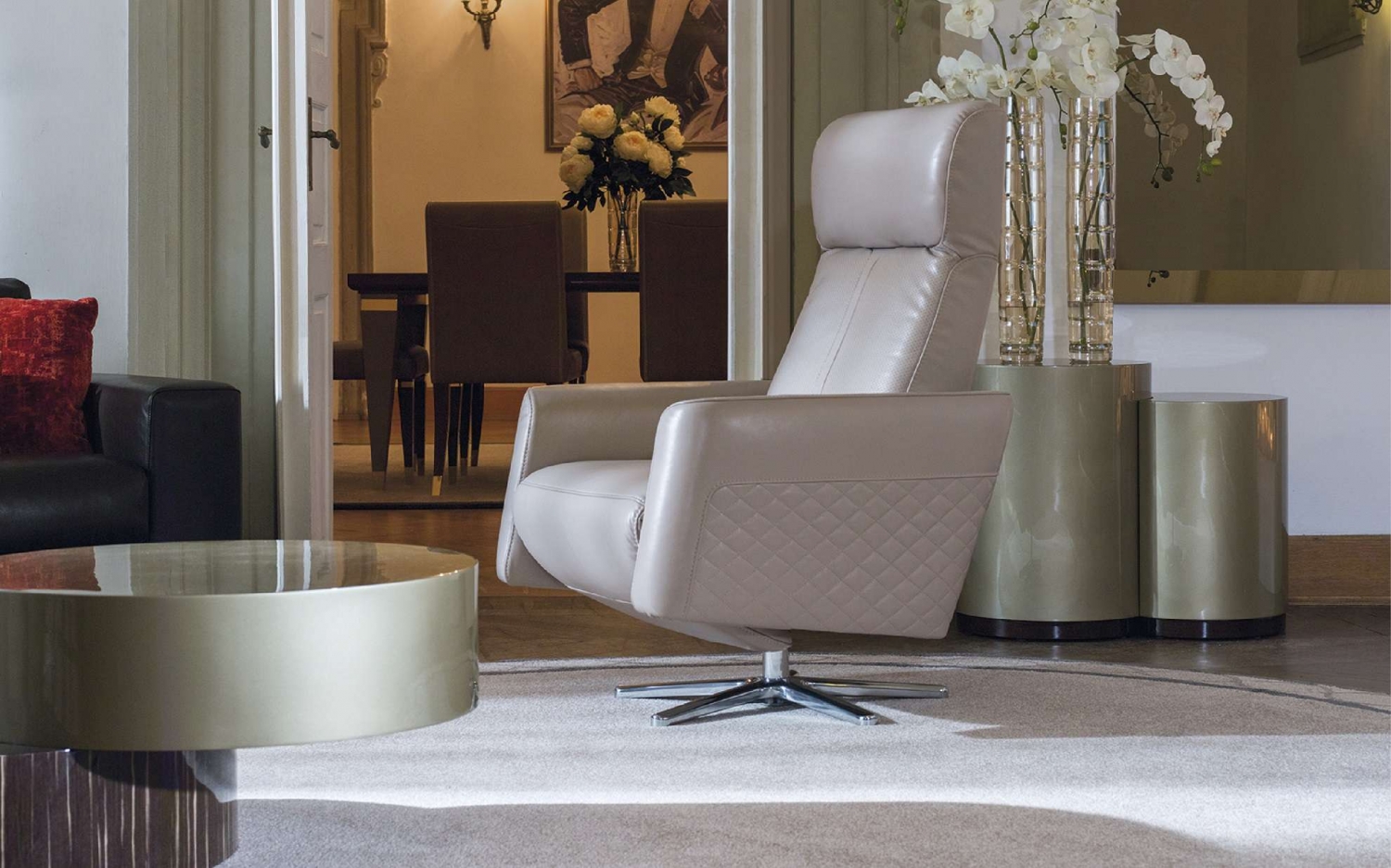 Relaxační funkce – vychýlení opěráku pomocí tlačítka s vysouvací opěrkou nohou ovládanou manuálně. Opěrka hlavy s nastavitelným úhlem. Opěrák a boky s designovým prošíváním a nebo variantně z perforované kůže. Možnost volby kruhového podstavce (kov nebo kov a kůže) nebo kříže.