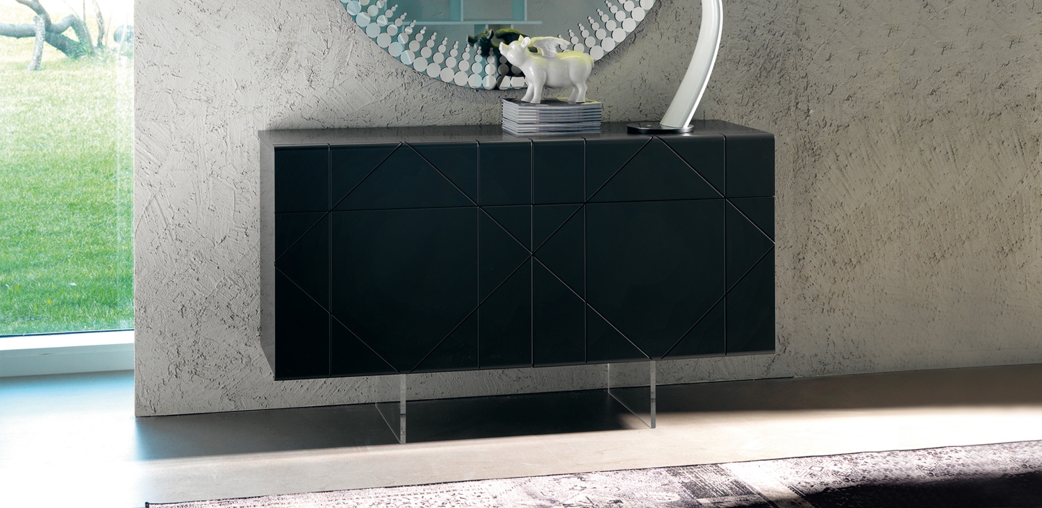 Komoda Tropez má dvířka a zásuvky v matném bílém nebo grafitovém laku. Nohy jsou z transparentního metakrylátu. Na vyžádání lze zhotovit vnitřní police z čirého skla.