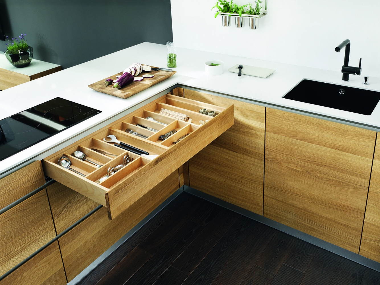 Elegantní přírodní dřevo hraje důležitou roli v designově oceněné kuchyni vao. Nenápadně sestavená kresba dřeva zvýrazní celkovou přírodní krásu tohoto materiálu. U spodních skříněk jsou úchyty vždy k uchopení odshora a umožní tak pochopit přírodní dřevo jako plně bezúchytovou kuchyň vao.