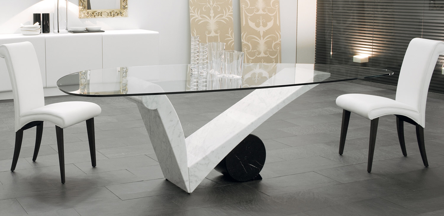 Základnu tohoto stolu tvoří kombinace mramorové nohy a válce z travertinu, bílého nebo černého mramoru. Stolová deska je z 15 mm silného čirého skla.