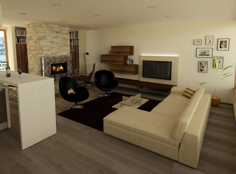 V druhé variantě je navržena tmavší podlaha a sedací souprava v kombinaci tmavě hnědé a krémové barvy, doplněné šedým kobercem.