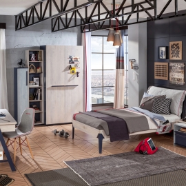 Výsledkem je moderní nábytek Trio s mnoha funkčními prvky, v industriálním stylu. Kromě nepostradatelného tlumení pojezdů zásuvek a pantů dveří zde najdete praktické nástavce psacích stolů s pohyblivým osvětlením, kapsářem, tabulí, USB vstupem. Kapsářem a USB vstupy jsou vybaveny i postele, které můžete zvolit v rozměru lůžka 100 x 200 cm, 120 x 200 cm i 140 x 200 cm. Pod postelí se může skrývat praktický výsuv jako úložný prostor nebo přistýlka. Teenageři rádi tráví čas na posteli s notebookem, poslouchají hudbu, čtou si časopisy nebo se zde učí. Pro jejich pohodlí je čelo opatřeno snímatelným čalouněním, jež je navíc oboustranné. Přes den je praktické přes lůžkoviny dát přehoz na postel. Ten je navržen v designu celé kolekce a jeho součástí je i speciální držák na tablet. Úložný prostor se nastaví v pokoji jednoduše pomocí kombinace jednotlivých elementů – otevřené i uzavřené skříňky, komody, věšáky, atd..
