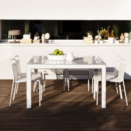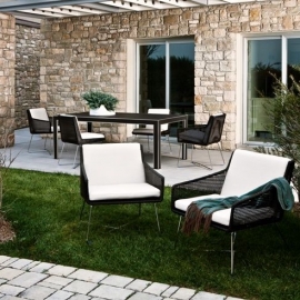 Vzhledem ke svému elegantnímu a odlehčenému zpracování vypadá nábytek Varaschin dobře jak v prostorách teras či zahrad, tak v interiéru nebo třeba i u baru. Vidět zde můžete křesílka a lehátka a Babylon utkané ze syntetického lana v kombinaci s hliníkovou konstrukcí od designérského studia Giopato & Coombes a jídelní stůl Kolonaki s masivní ocelovou podnoží od studia Calvi&Brambilla doplněný židlemi Clever. Ty jsou díky hliníkovému rámu, sedáku i opěrce lehké a zároveň odolné a lze je jednoduše přesunout z místa na místo.