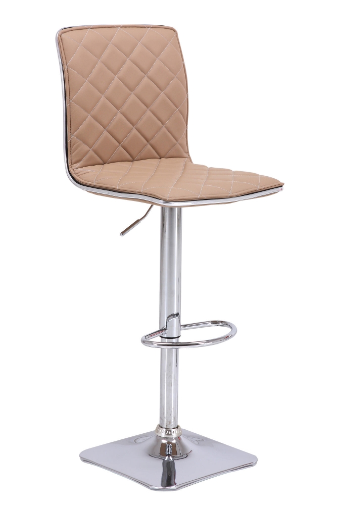 Moderní, elegantní barová židleProvedení se smyslem pro detail Výškově nastavitelný sedák snadno přizpůsobíte potřeběPotah textilní kůže příjemná na dotyk, elegantní prošíváníLuxusní vzhled podtrhuje ozdobný chromový rámeček okolo sedákuChromovaná čtvercová podnož s praktickou opěrkou na nohy