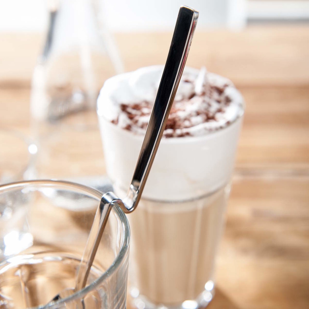 Zahnutá lžička, která může viset na okraji sklenice nebo šálku. Moderní příbory bez zbytečného zdobení se zalíbí každému. K dostání i další příbory, také ke kávovému servisu. Záruka 10 let. (Bez sklenice)