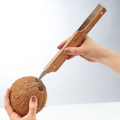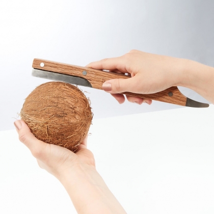 Zpracovat celý kokosový ořech bylo vždy hodně náročné. S COCONUT nožem na kokos se to změní. Nejdříve zapíchněte osten do měkkého oka ořechu, abyste se dostali k výbornému kokosovému mléku. Potom silou zaryjete kovovou stranu nože podélně do skořápky ořechu a přitom ořech v ruce otáčejte. A už držíte v dlaních dvě půlky ořechu a můžete se těšit na lahodný vnitřek.