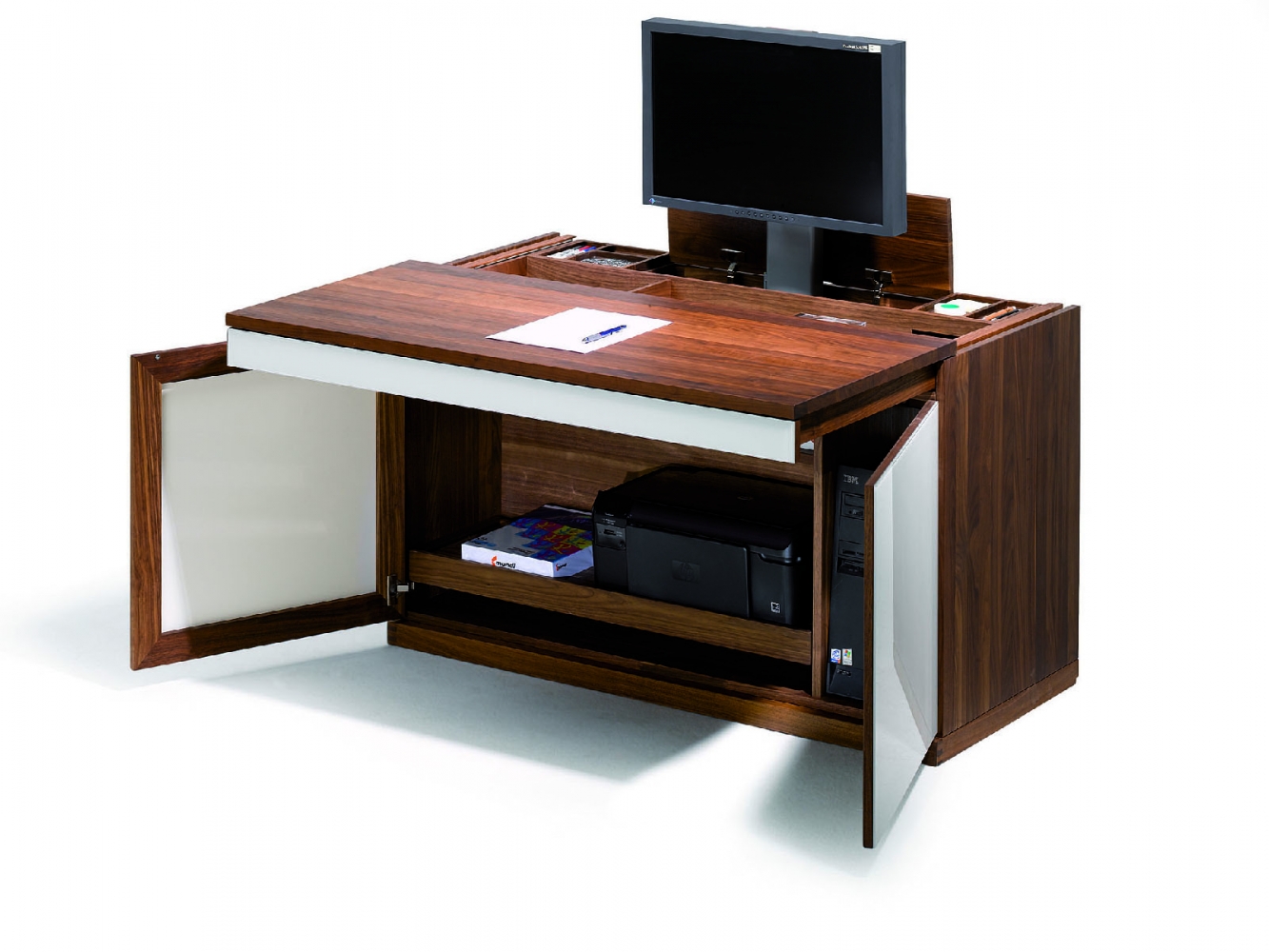 Uzavřený působí sekretář cubus jako elegantní komoda. Otevřený ukáže své rafinované detaily. Vysunutá deska slouží jako psací stůl, klávesnice a psací potřeby jsou pohodlně uloženy a ve variaci s výsuvnou obrazovnkou je pohodlně uložen i monitor. Mimořádně komfortní je u sekretáře cubus plynule výškově nastavitelná obrazovka. Stisknutím tlačítka nastavíte výšku displeje.