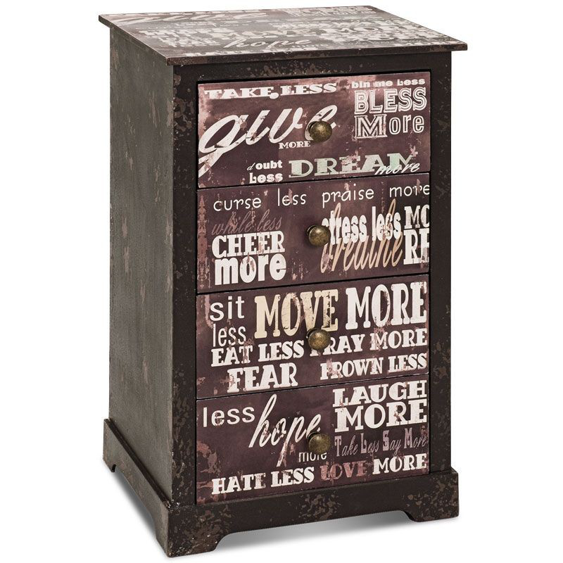 Solitérová zásuvková komodaTrendy vintage design s industriálními prvkyDoplněk pro oživení interiéruMateriál MDF, dekor písma s patinouStylové kovové knoflíkové úchytyDodáváno ve smontovaném stavu