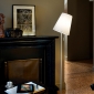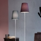 Stojací a čtecí lampa. Osvětlení s klasickým zapínáním a stmívačem. V bílé nebo černé barvě. Kovová konstrukce z matného nebo saténového lakovaného niklu.
