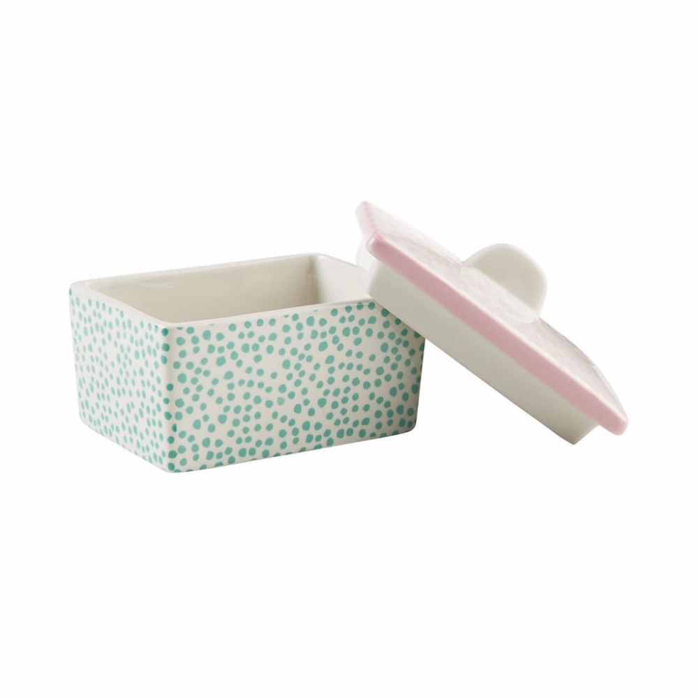 Dobrá nálada u stolu! Mátovo-růžová dóza na máslo MISS DAISY vyzařuje svým šarmem u každého jídla, dokonce i při snídani. Nyní můžete svůj den začít opravdu s úsměvem. Porcelánová série nádobí MISS DAISY přináší na Váš stůl moderní trendy barvy i vzory. Ať už hrnky, talíře, misky, kalíšky na vejce, další dózy nebo vázy v pastelových barvách s květinami, puntíky nebo proužky. Vše kombinujte dle nálady a libosti, dle interiéru či aktuální trendů.