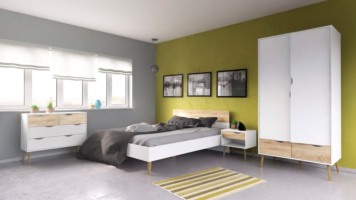 Postel je navržená v retro stylu a má velmi jednoduché provedení, které působí elegantním dojmem. Bude se hodit do každého interiéru díky svému jednoduchému a neutrálnímu barevnému zpracování. Postel je v bílé barvě a čelo postele září v dekoru dub. Rošt ani matrace nejsou součástí postele. Doporučujeme doobjednat vhodný rozměr: 140x200 cm. Stojí na vysokých šikmých dřevěných nožkách taktéž v dekoru dub, který dodává na skandinávském stylu. Nábytek je vyrobený z kvalitního lamina o tloušťce 18 mm. Postel patří do sektorové řady, ze které si lze složit stylový obývací pokoj, ložnici, předsíň či jídelnu. Přesná šířka postele je: 145,5 cm a hloubka je: 207,5 cm. Postel nabízíme i v jiných rozměrech. Zboží je dodáváno v demontu.