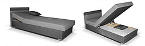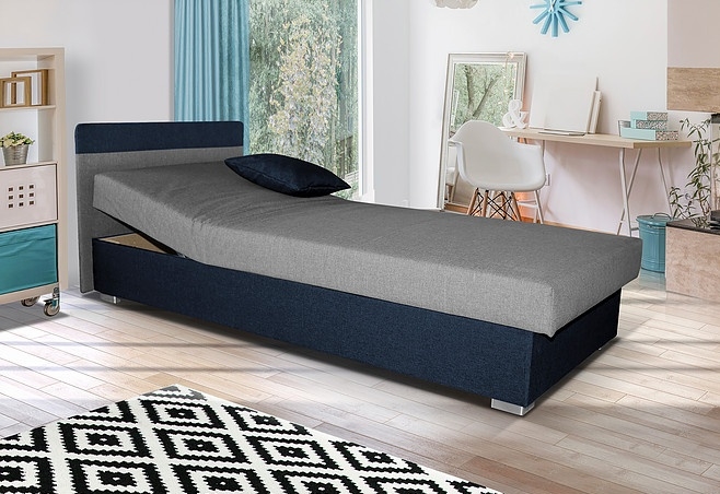 Válenda v kombinaci šedé a modré barvy patří k oblíbeným typům čalouněných postelí. Je polohovací a má úložný prostor příštupný od nohou. Čelo u hlavy chrání před ošoupáním a ušpiněním stěny, ale může sloužit i k opření (výška čela je 73 cm). Matrace je pružinová. V ceně je 1 polštářek. Nabízíme jí ještě v kombinaci šedé a černé barvy a šedé a modré barvy.