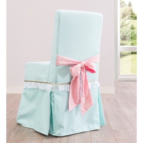 Světle modrý potah židle sahá až na zem a je zdobený krajkou.