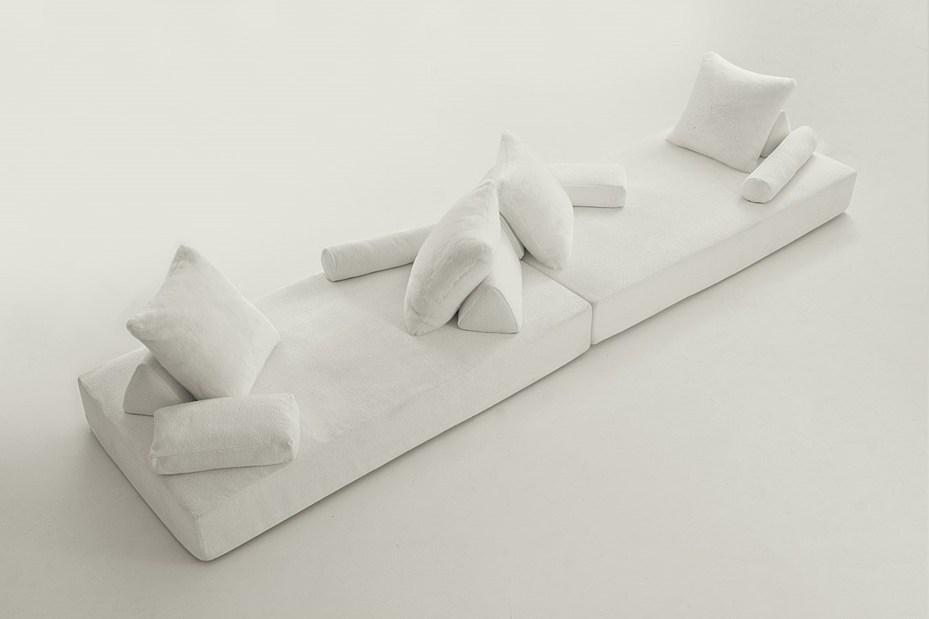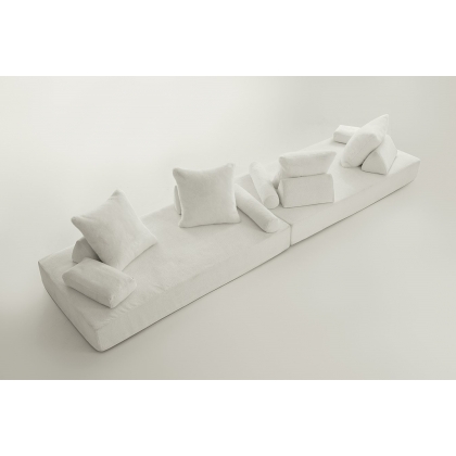 Odpočiňte si na sedací soupravě, která nemá žádná omezení a inspirovala se orientem. Komfort je zajištěn měkkým polstrováním z Gellyfoam® a řadou podpěr z různé tloušťky. Trojúhelníkové polštáře slouží k podpěře velkým čtvercovým polštářům, o které se můžete pohodlně opřít. Válcové polštáře slouží jako područky.