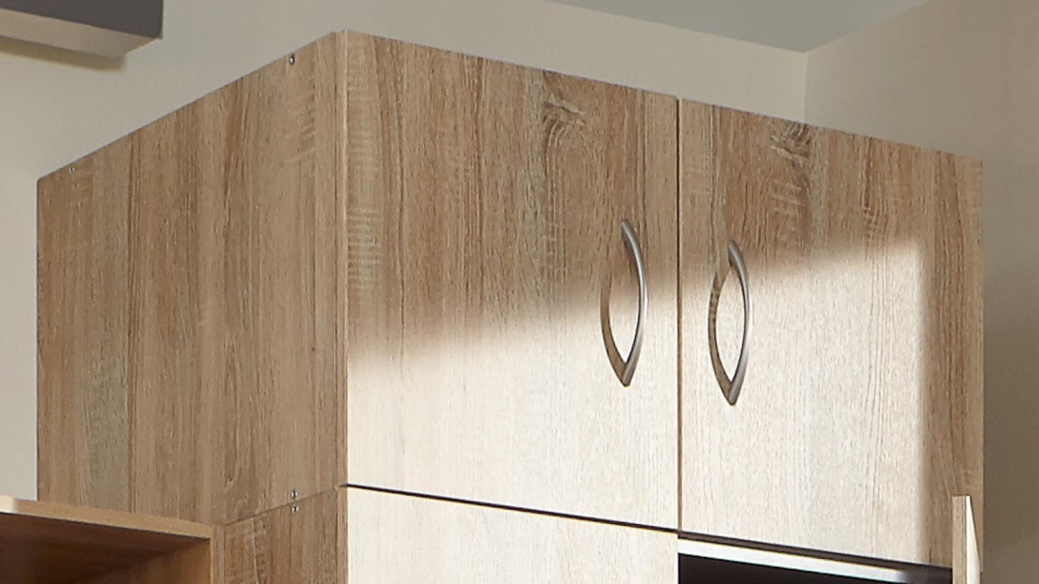 Moderní nástavec na skříňNeutrální vzhled v dekoru dřeva Materiál snadno udržovatelné laminoDodáváno v demontu