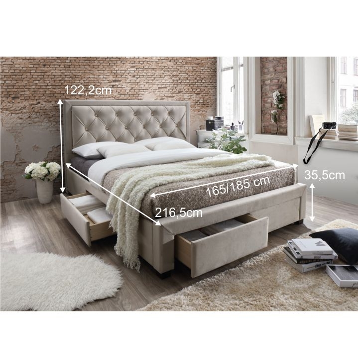 Luxusní moderní postel s vysokým prošívaným čelem a praktickým úložným prostorem, který tvoří celkem 4 zásuvky. Součástí postele je i rolovaný rošt. Postel je v příjemné šedohnědé látce s dřevěnými nohami v dekoru dub wenge. Přesné rozměry jsou 185x216,5x122,2 cm (ŠxHxV). Ložná plocha činí 180x200 cm, výška ložné plochy je 35,5 cm. Možnost dokoupení matrace o rozměru 180x200 cm nebo 2x 90x200 cm na základě naší nabídky. Zboží je dodáváno v demontu.