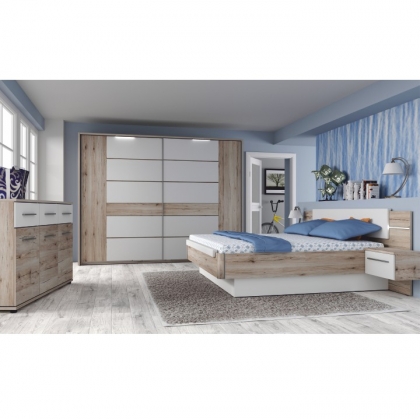 Dvoulůžko a 2 noční stolky včetně LED osvětlení. Čelo postele je očalouněno v bílé ekokůži. Postel je vyrobena z laminované DTD desky v jemné kombinaci dekoru dub bergamo s bílými prvky. Ložná plocha činí 180x200 cm. Rošt ani matrace nejsou v ceně zboží. K posteli doporučujeme zakoupit rošt v pevném rámu a matrace o rozměru 180x200 cm nebo 2x90 cm z naší široké nabídky. Zboží je dodáváno v demontu.