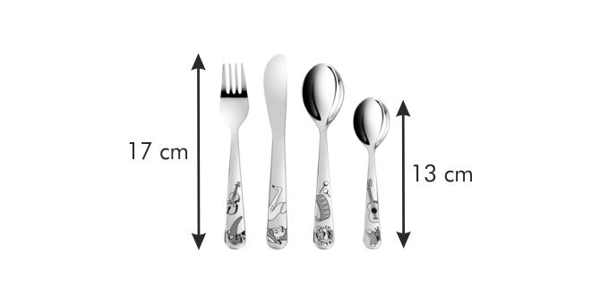 Soupravu s originálními obrázky veselých muzikantů tvoří dětský jídelní nůž, jídelní vidlička, polévková lžíce a čajová lžička.