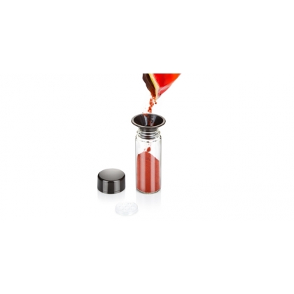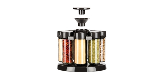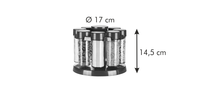 Luxusní souprava vynikající pro uložení koření na kuchyňské lince i jídelním stole. Koření je uloženo přehledně, díky otočnému stojánku je snadno dostupné. Násypka pro snadné plnění kořenek je uložena ve stojánku. Kořenky jsou univerzální, dodávány s 8 víčky pro mleté koření a 8 náhradními víčky pro koření celé. Vyrobeno z prvotřídního odolného skla a kvalitního plastu. Skleněné dózy, víčka, uzávěry a násypka jsou vhodné do myčky, stojánek čistěte vlhkou utěrkou. 3 roky záruka.