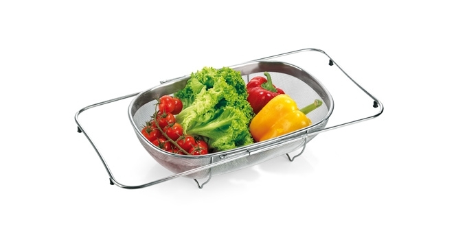 Rozložený koš proto pohodlně umístíte na okraj dřezů všech obvyklých velikostí a čerstvou zeleninu nebo ovoce i jiné pokrmy můžete důkladně opláchnout a nechat odkapat.