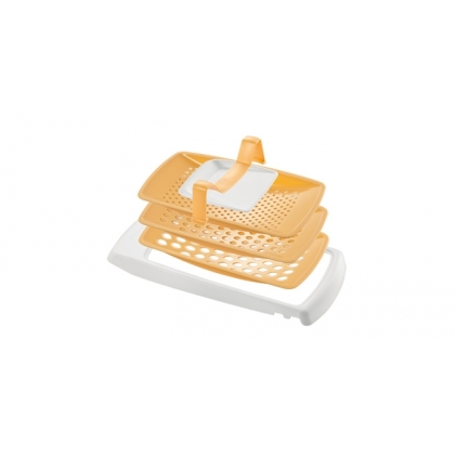 Má 3 samostatná síta s různě tvarovanými otvory: síto s velkými otvory pro halušky, středními otvory pro noky a malými otvory pro zavářky do polévky.
