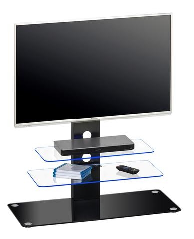 Kompaktní a praktický TV stojanSnadno integrovaný v moderním interiéruDostatek prostoru pro multimediální zařízeníMateriál kombinace tvrzeného skla a kovuOtočný, výskově nastavitelný TV držák - otočný o 30°Ideální řešení pro optimální pozorovací úhelVhodný pro televizory do max. 55 palcůDoporučená nosnost držáku 40 kgPraktická zadní panel pro vedení kabelůModré LED podsvícení polic se prodává samostatněPraktické balení v demontu usnadní transport